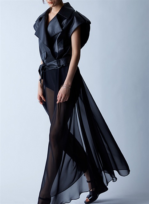 スペインの高品質なラム革を使用したラップ式のバイカージャケット。ライダースジャケットの雰囲気を纏うこのジャケットはラップ式でウエストベルトで絞って着用します。そして透明感のある素材で仕立てられた袖はファスナーを取り外すとフレンチスリーブのショルダーラインのベストとして着用できます。