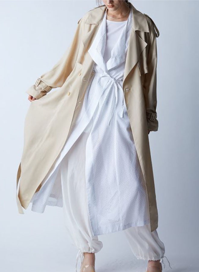 スパンポリエステル糸を使用した透け感のあるツイル素材のトレンチコート。分量感たっぷりなオーバーサイズシルエット、深めのサイドスリットが軽快で、かすかに透ける感じが春らしさを感じさせてくれます。【お手入れについて】素材情報:ポリエステル100%原産国:中国