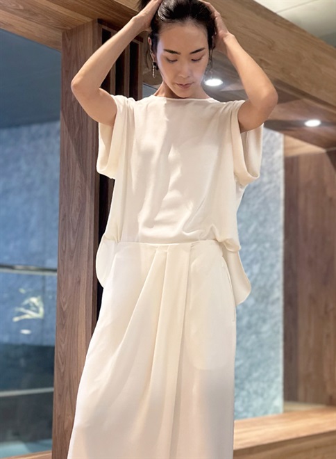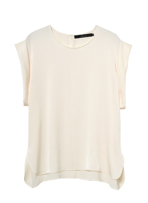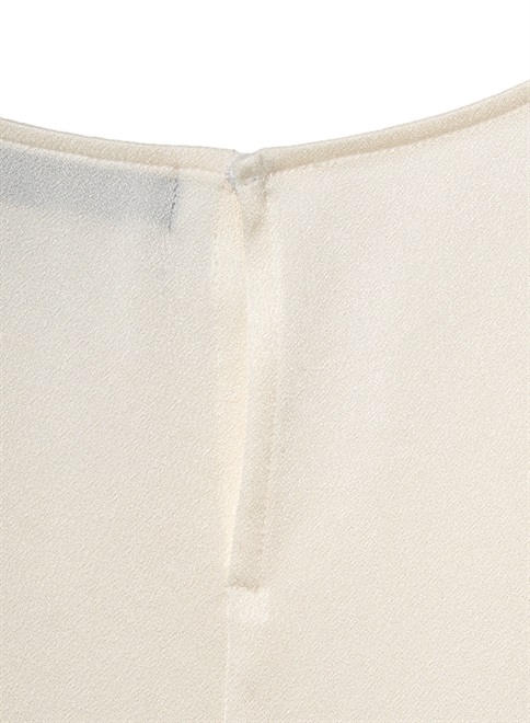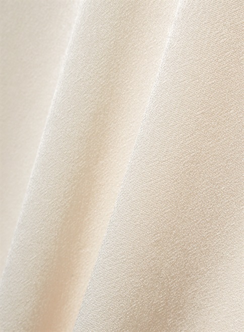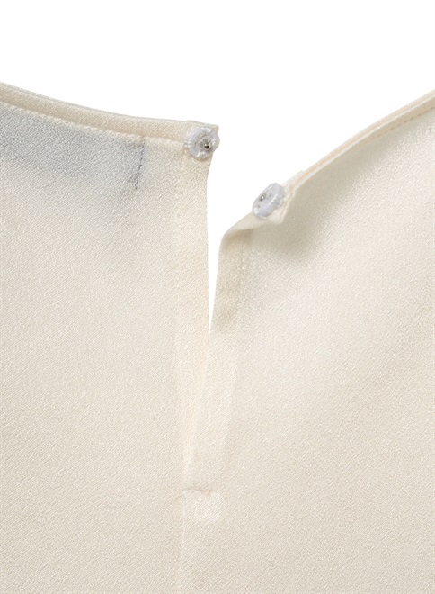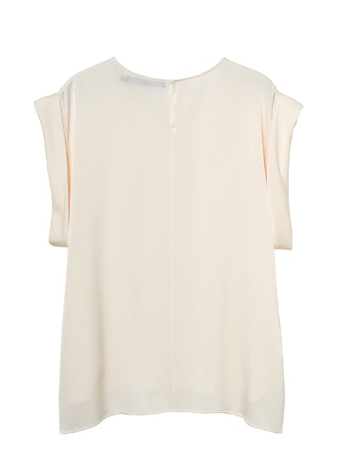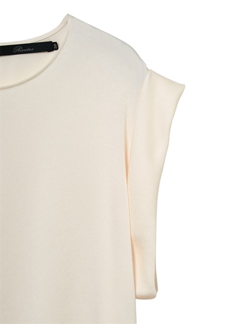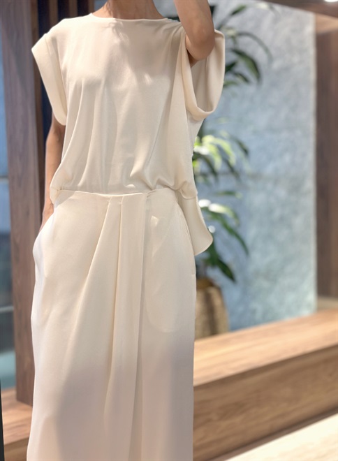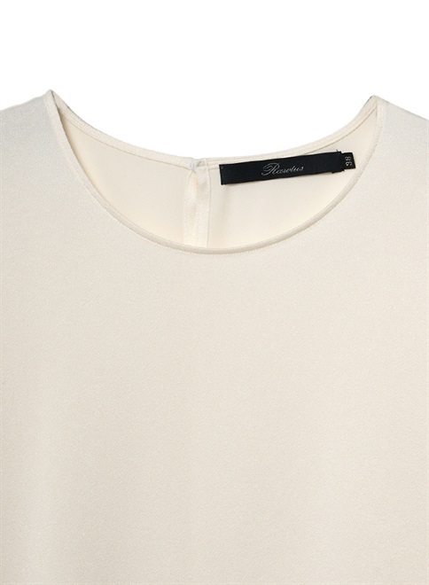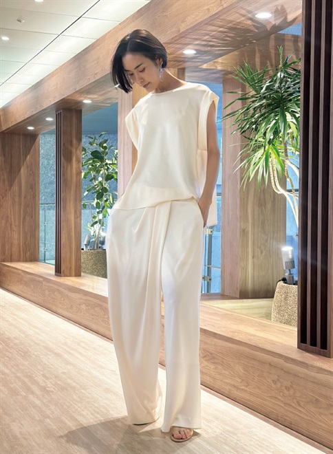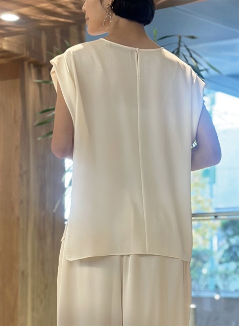 シルクのような自然な光沢とドレープが特徴のサテン織のトリアセテート素材を使用。袖をロールアップしたようなデザインが特徴のトップス。この商品はモデルの小林有里さんがホワイトコーデの白に拘った逸品。同素材のフロントドレープパンツ(R61-PP5014)とのセットアップやレザージャケットのインナーとしても最適。シワにもなりにくくご家庭での洗濯も可。