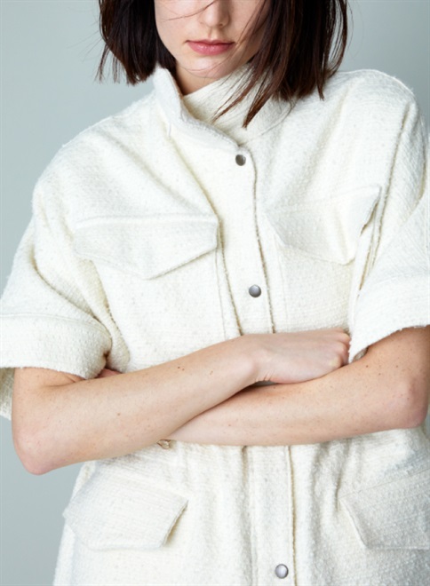 テキスタイルの凹凸感を際立たせた女性らしいクラシカルなファンシーツイードとミリタリージャケットM-65を融合させた意外性のある独特なアイテム。【お手入れについて】素材情報:毛55% アクリル17% ポリエステル16% モヘア5% アンゴラ1% レーヨン1%原産国:日本